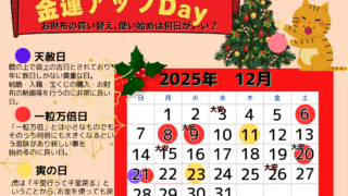 お知らせ12月金運カレンダー 12月21日 今年最後のWラッキーDay! 一粒万倍日と天赦日が重なる今年最後の日。この日に、新しいお財布を買って、新年から使い始めるというのはどうですか?2025.11.27お知らせフミヤ メイト店